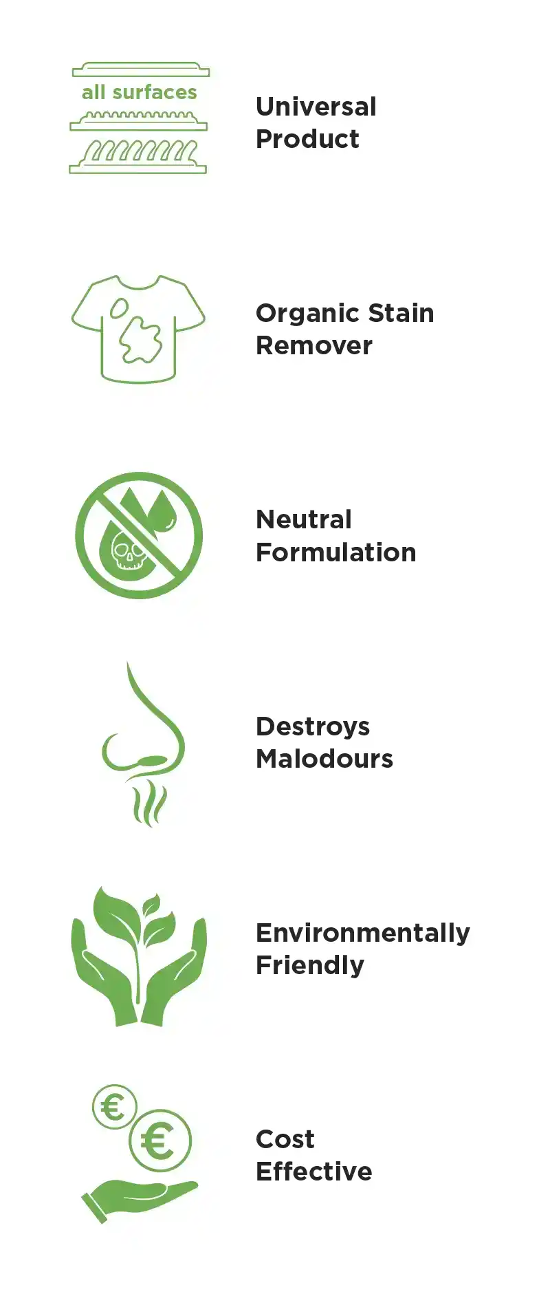 Is a safe and efficient all-in-one product Microbial treatment for deodorising, and removing the organic cause of the odour on both hard and soft surfaces. Highly effective against odours created by urine, waste, pets, vomit, food, dairy.